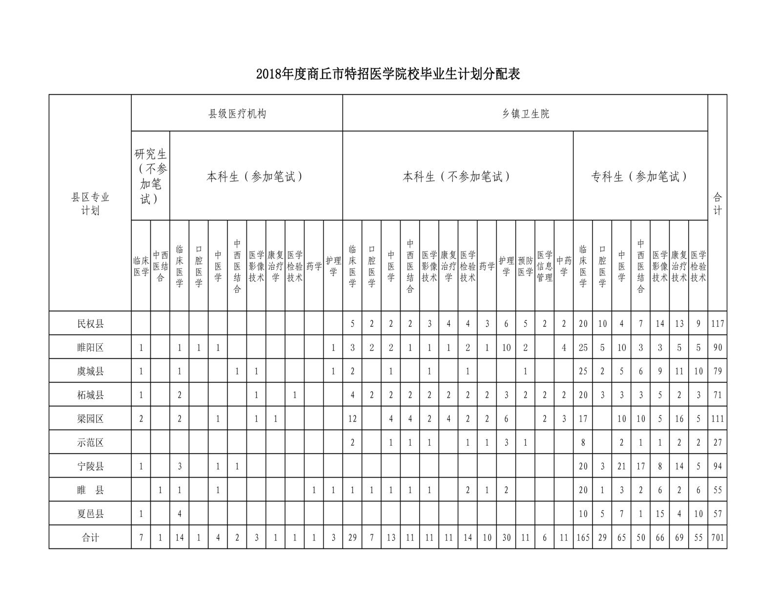 2018年商丘市醫(yī)學(xué)院校畢業(yè)生特招計(jì)劃人數(shù)701人,其中縣級(jí)醫(yī)療機(jī)構(gòu)招聘研究生8人、本科生30人;鄉(xiāng)鎮(zhèn)衛(wèi)生院招聘本科生164人、專科生499人。詳見下圖計(jì)劃分配表: