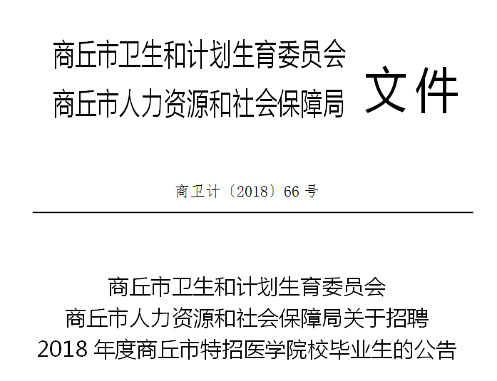 為實(shí)施好醫(yī)學(xué)畢業(yè)生特招計(jì)劃,根據(jù)《河南省人民政府辦公廳關(guān)于實(shí)施基層衛(wèi)生人才工程的意見》(豫政辦〔2014〕161號(hào))、 河南省衛(wèi)生和計(jì)劃生育委員會(huì)等九部門《關(guān)于印發(fā)基層衛(wèi)生人才工程實(shí)施方案的通知》(豫衛(wèi)發(fā)〔2015〕2號(hào))、 河南省衛(wèi)生和計(jì)劃生育委員會(huì)等七部門《關(guān)于實(shí)施基層衛(wèi)生人才工程的補(bǔ)充意見》(豫衛(wèi)發(fā)〔2016〕1號(hào))等文件規(guī)定,現(xiàn)就做好2018年度商丘市醫(yī)學(xué)院校畢業(yè)生特招計(jì)劃公告如下: